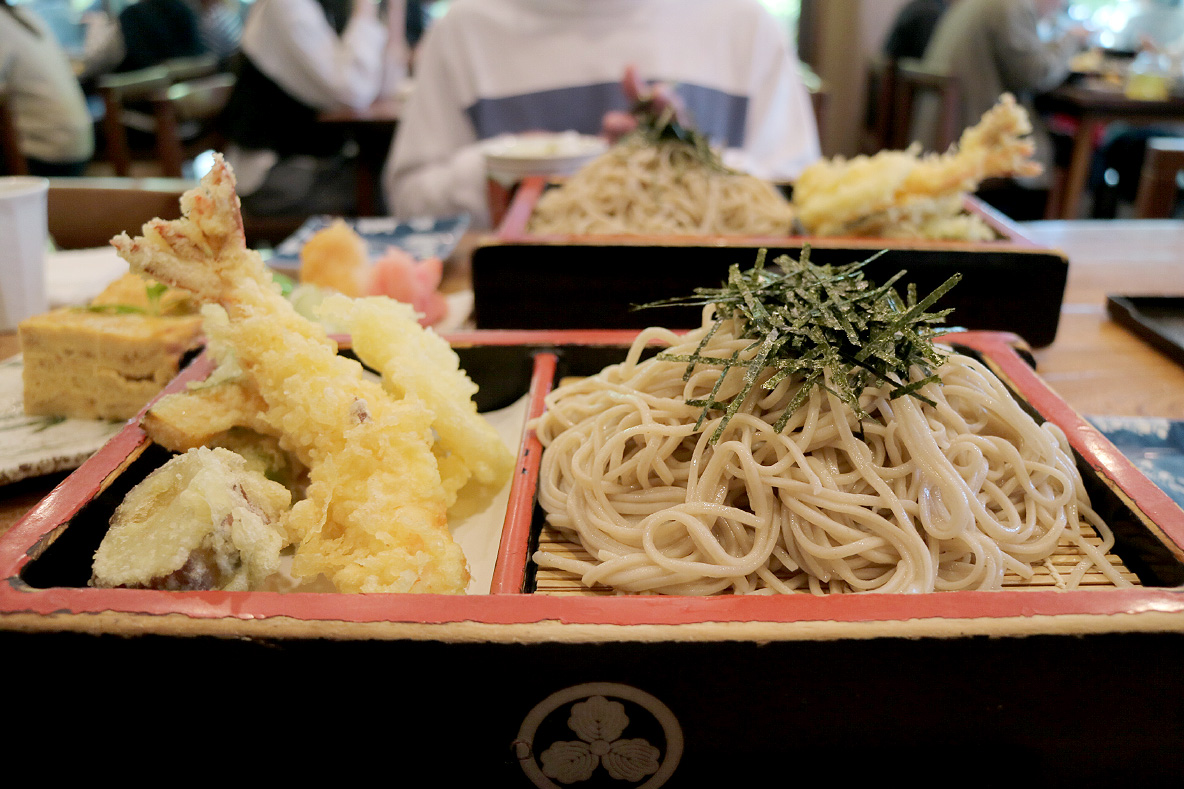 昼食は四柱神社の横にある老舗蕎麦屋「こばやし」で、迷わず天ぷら蕎麦を注文。