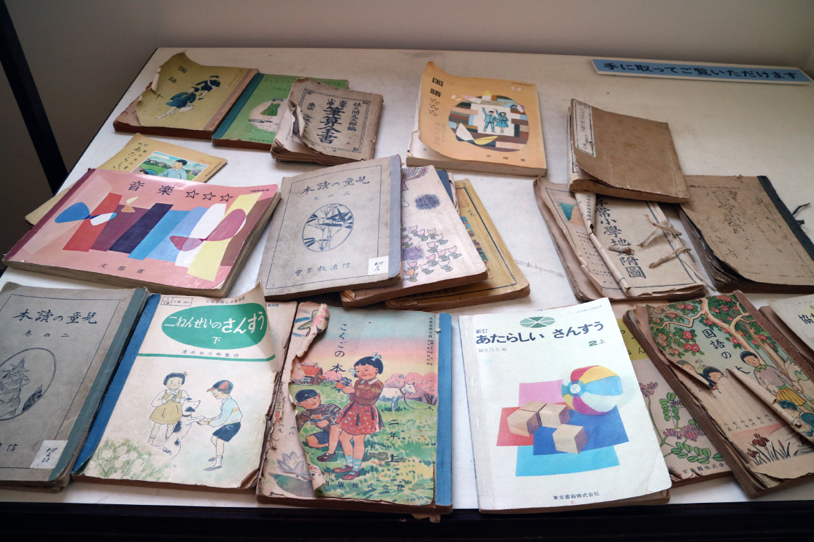館内には、当時実際に使われていた机や椅子、教科書などの貴重な展示品が並び、