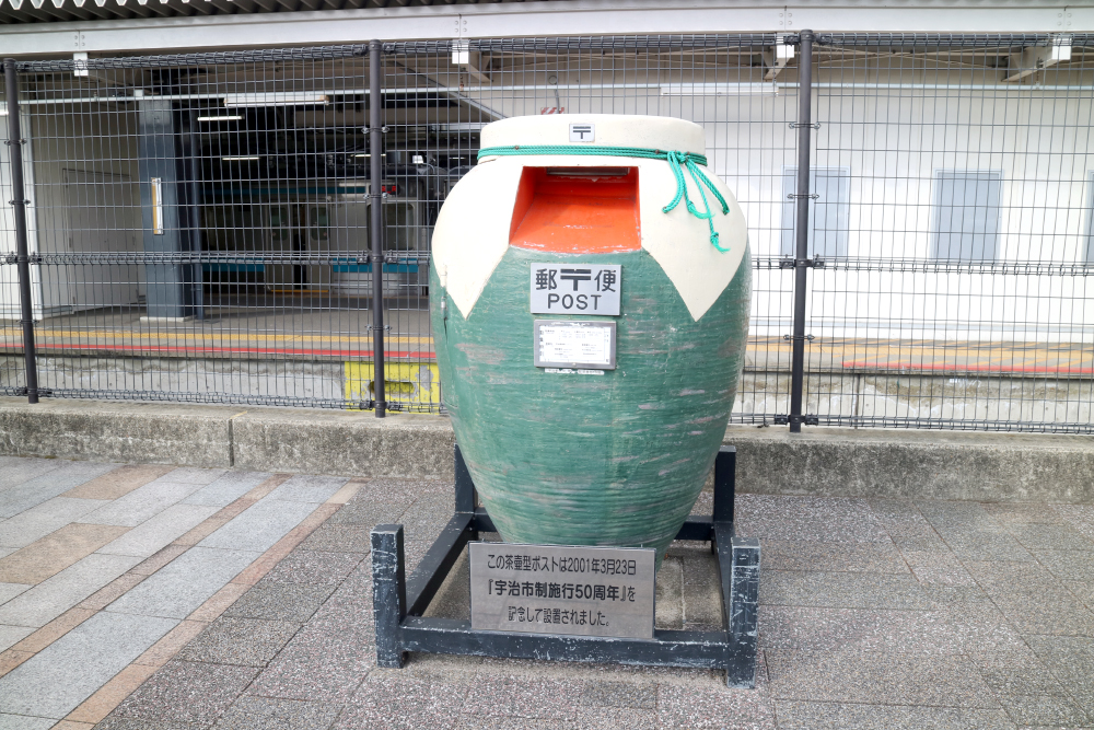 駅前には、宇治市制施行50周年を記念した茶壺ポストが設置されていました。