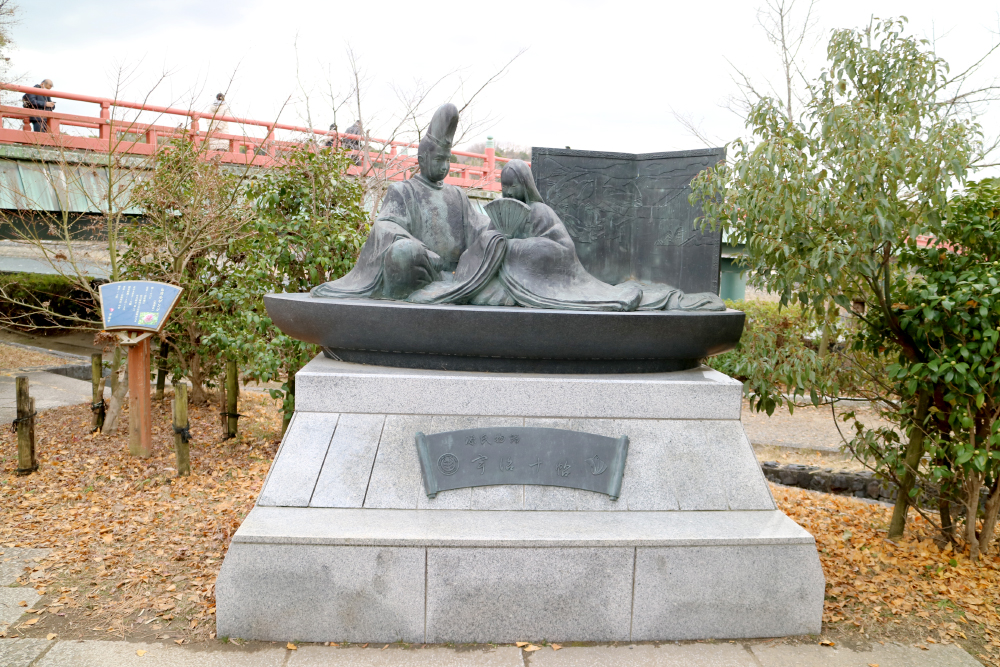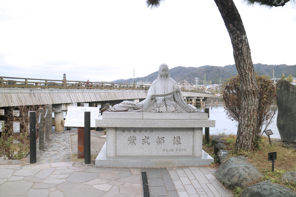 朝霧橋のたもとには、源氏物語「宇治十帖」の古跡を象徴するモニュメントが設置されていました。