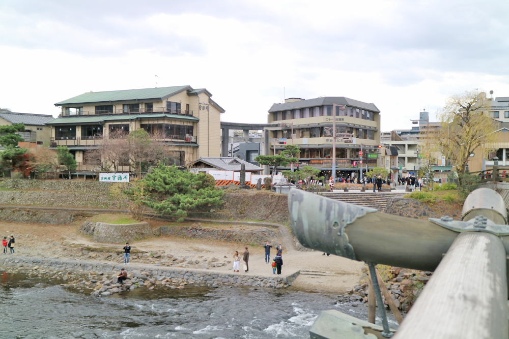 橋の上から眺めると、平等院表参道の風景も絶妙です。