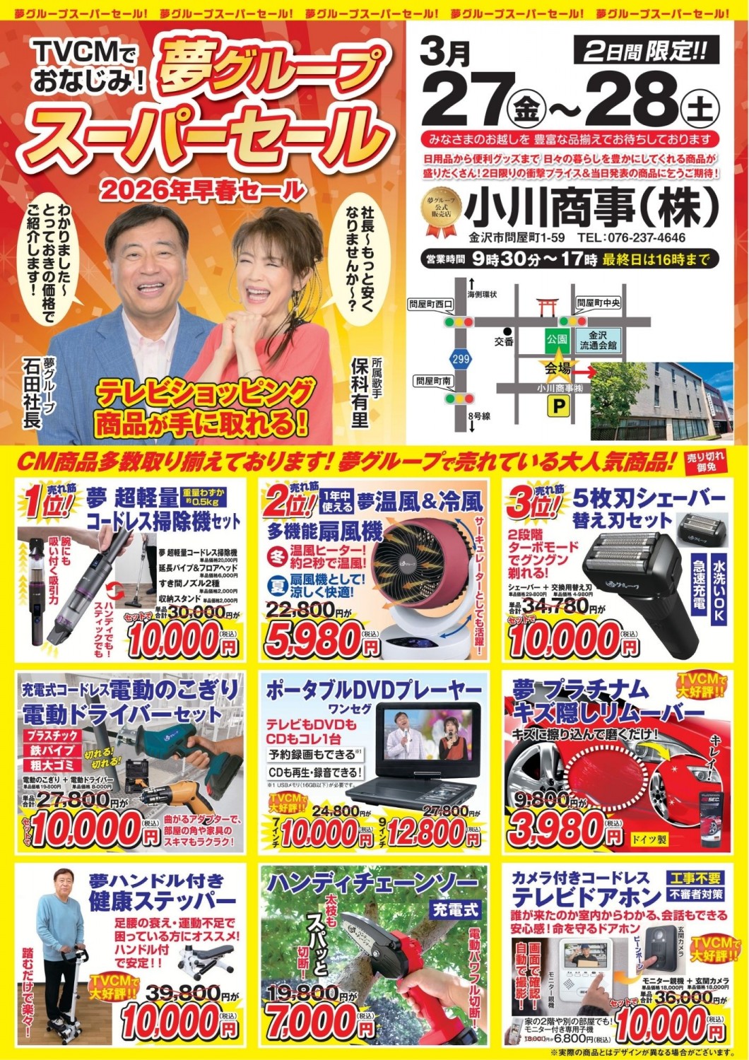 夢グループ・スーパーセール開催 (2026.03.23) 3月27(金)28(土)2日間限定にて夢グループ・スーパーセールを開催します。 TVでお馴染みの商品をサンプル30品目ご用意し、見て触れてお楽しみいただけるファン待望の販売会です。 当日北國新聞朝刊折り込みチラシでラインナップをご確認下さい。(一部配布地域は限定されます) 商品に限りがございますので早めのご来店を待ち申し上げております。 < 前に戻る