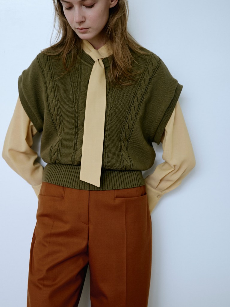繊細な透け感とウールの温かみがある、上品なボウタイブラウスと立体的なケーブル柄を際立たせたニットジレ。