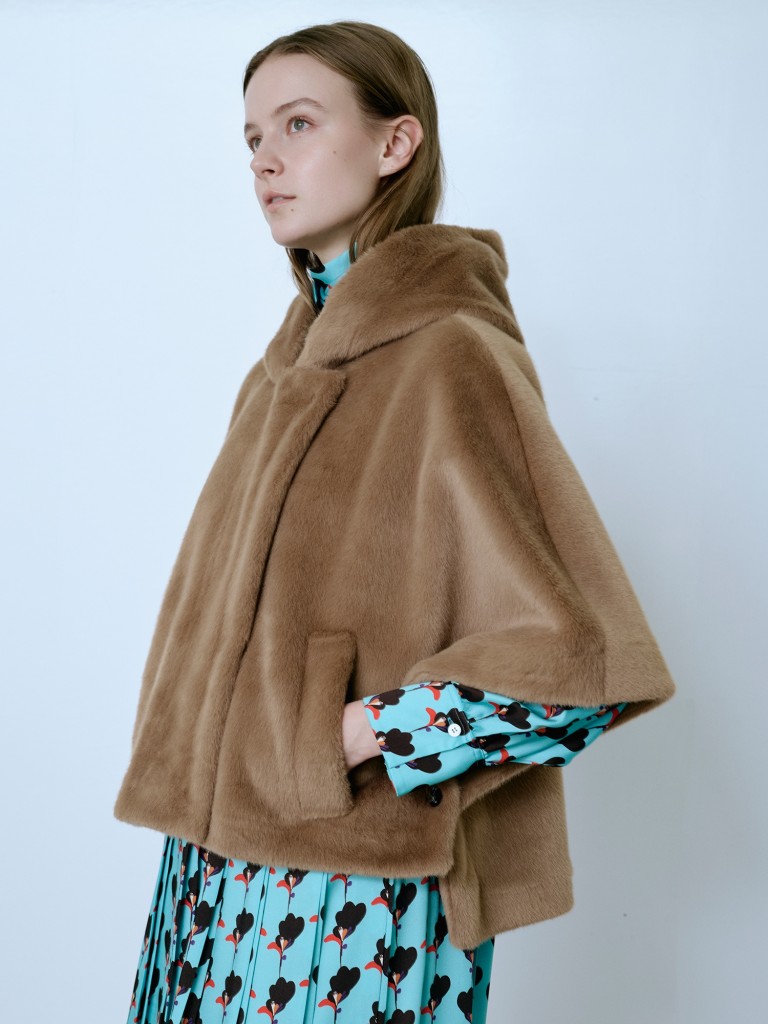 毛足の短い上質なフェイクファーと、肌触りの良いスエードをボンディングしたオリジナル素材のコート。柔らかく滑らかなフェイクファーを使用しているため、つやとドレープ感が際立つのが特徴です。