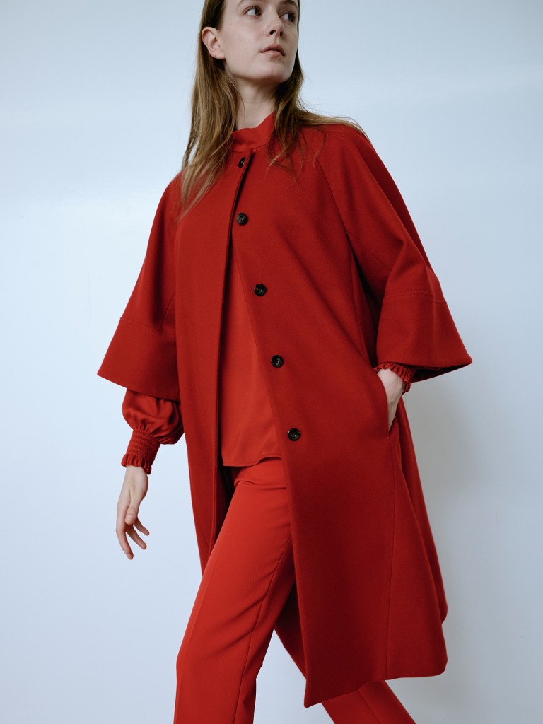 美しいAラインシルエットの七分袖ノーカラーコート。素材には、ニューイングランドラムを使用しています。